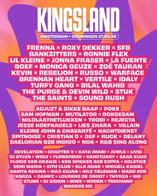 Kingsland Groningen on April 27, 2026 at Stadspark Groningen, All features Russo, Brennan Heart, DEF (3), Kevin, Noa (DE), Soltice, Sound Rush, The Purge, Spitnoise, Malibu and NOON (2) performing hip-hop DJ sets.