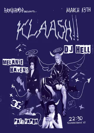 KLAASH! with DJ Hell on March 13, 2026 at Sameheads, Berlin features DJ Hell, Paty Vapor and Melanie Havens performing electronic DJ sets.