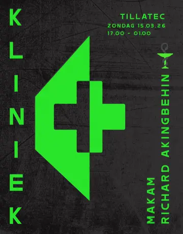 KLINIEK takes place at TILLATEC in Amsterdam, Netherlands on Sunday, March 15, 2026. Featuring Makam, Richard Akingbehin. House, Dub Techno.