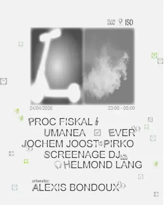 Klub Krai w/ Proc Fiskal, EVER, jochem vs pirko, screenage dj b2b Helmond Lang, umanea on April 24, 2026 at ISOamsterdam, Amsterdam features Proc Fiskal, EVER, screenage dj, Helmond Lang and umanea performing experimental DJ sets.