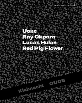 Klubnacht at Golden Gate in Berlin, Germany, on May 1, 2026, features a lineup of electronic music artists. Uone, known for his deep house productions, hails from Australia and has released tracks on labels such as Balance Music. Ray Okpara is a Nigerian-German DJ and producer recognized for his minimal house style. Lucas Hulan, a rising figure in the electronic scene, combines various house influences in his sets. Red Pig Flower, a Berlin-based artist, is known for her unique blend of techno and experimental sounds. This event showcases house and techno genres.