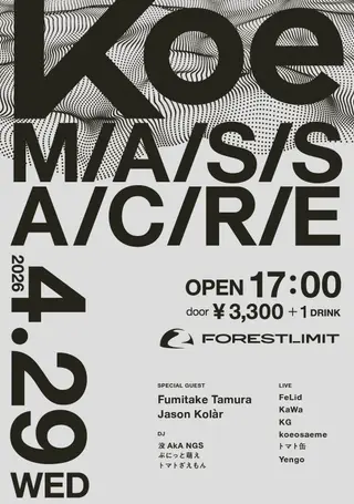 【KOE M/A/S/S/A/C/R/E】 takes place at Forestlimit in Tokyo, Japan on April 29, 2026. Featuring Fumitake Tamura, FeLid, KAWA, Yengo and 1 more. Downtempo and Experimental sounds all night.