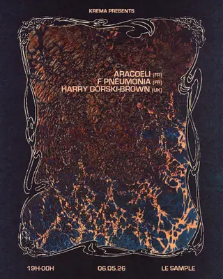Krema presents: Harry Górski-Brown, Aracoeli, F.Pneumonia takes place at Le Sample in Paris, France on May 6, 2026. Featuring Harry Górski-Brown.