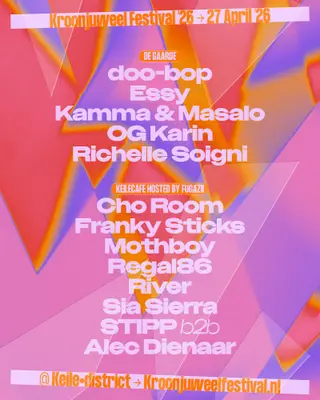 Kroonjuweel 2026 on April 27, 2026 at Keile District, Rotterdam features doo-bop, Essy, Richelle Soigni, Kamma, Masalo, OG Karin, Franky Sticks, Cho Room, STIPP and Alec Dienaar performing house DJ sets.
