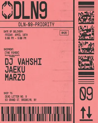Kudu: DJ Vahshi, Jaeku, Marzo - Dead Letter No.9 takes place at Cargo @ Dead Letter No. 9 in New York City, United States on April 10, 2026. Featuring DJ Vahshi, Jaeku. House and Electronica sounds all night.