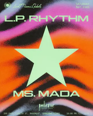 L.P. Rhythm takes place at Jolene Downtown Miami on May 23, 2026. The event features L.P. Rhythm, an artist known for their contributions to the house and tech house genres. Also performing is Ms. Mada, a producer recognized for her energetic sets and innovative sound within the same genres. This event will highlight house and tech house music.