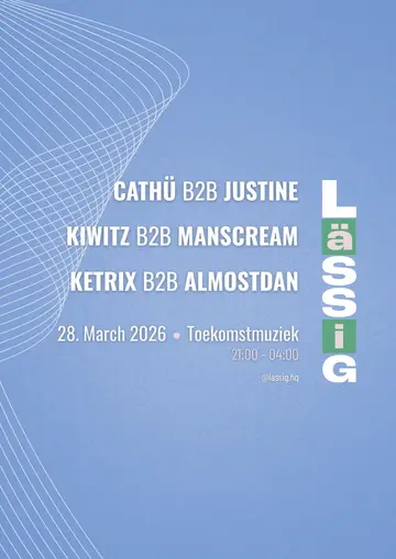 Lässig takes place at Toekomstmuziek in Amsterdam, Netherlands on Saturday, March 28, 2026. Featuring cathü, JUSTINE (NL), Ketrix, almostDan and 1 more. Progressive House, House.