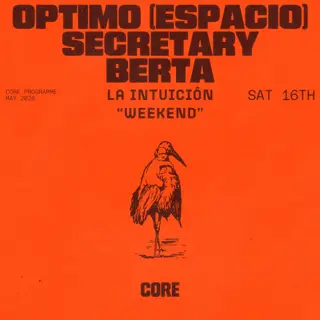 La Intuición feat. Optimo (Espacio) + Ninalash! + Berta takes place at Core in Madrid, Spain on May 16, 2026. Featuring Optimo (Espacio), Ninalash!, berta (ES). Techno and Tech House sounds all night.