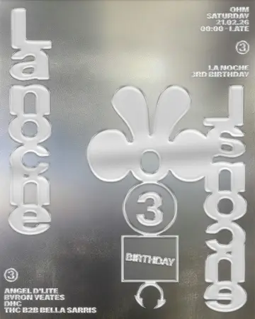 La Noche 3rd Birthday takes place at OHM in Berlin, Germany on Saturday, February 21, 2026. Featuring Angel D'lite, Bella Sarris, THC, Byron Yeates and 1 more. House.