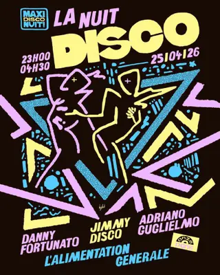 La Nuit Disco Vol. 10 takes place at Alimentation Générale in Paris, France on April 25, 2026. Featuring Danny Fortunato, Adriano Guglielmo. Deep House and Disco sounds all night.