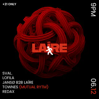 LAÍRE NIGHT 9 on June 12, 2026 at TBA - Released 24 Hours Prior to Event, Detroit features DJ Candor, LOFILA, JANSØ, LAÍRE, Townes and Redax performing techno DJ sets.