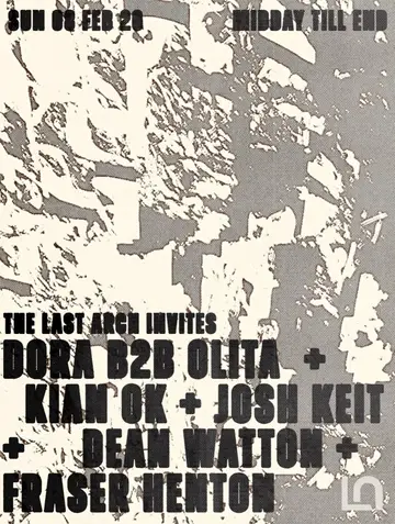 Last Arch Invites takes place at Last Arch in London, United Kingdom on Sunday, February 8, 2026. Featuring Olita (UK), Moon Coral, Kian OK, Josh Keit and 1 more. Techno, House.
