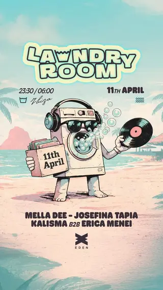 Laundry Room takes place at Eden in Ibiza, Spain on April 11, 2026. Techno and Tech House sounds all night.