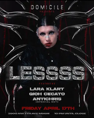 LESSSS takes place at Domicile in Miami on April 17, 2026. The event features the artist LESSSS, known for their work in the techno genre. LESSSS is recognized for their distinctive sound and contributions to the scene. This event focuses on the techno genre, showcasing a singular artist from the lineup.