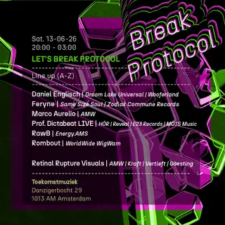 LET'S BREAK PROTOCOL takes place at Toekomstmuziek in Amsterdam, Netherlands on June 13, 2026. Featuring Daniel Englisch, Feryne, Professor Dictabeat, RawB. Techno and Electro sounds all night.