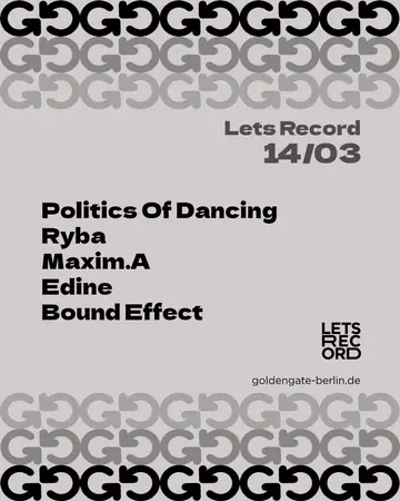 LETS RECORD with Politics Of Dancing, RYBA, Maxim.A, Edine, Bound Effect takes place at Golden Gate in Berlin, Germany on Saturday, March 14, 2026. Featuring Politics Of Dancing, RYBA, Edine, Bound Effect.