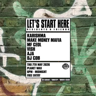 LET'S START HERE takes place at Planet Wax in London, United Kingdom on May 7, 2026. Featuring Make Money Mafia, vish, AJA. Drum & Bass and Garage sounds all night.