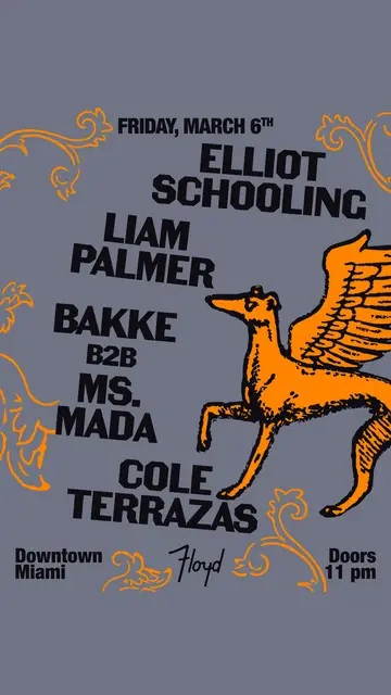 Floyd in Miami, United States presents Liam Palmer & Elliott Schooling 2026, a curated electronic music experience on Friday, March 6, 2026, featuring Liam Palmer, Cole Terrazas, Ms. Mada and 1 more artists. This event brings together artists and fans who share a passion for dance music culture and House, Tech House sounds.