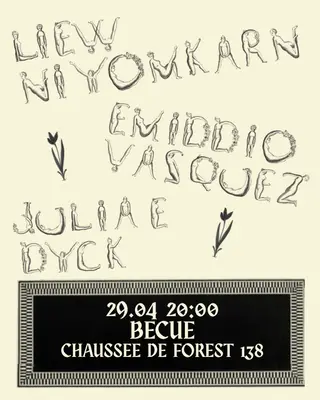 Liew Niyomkarn, Emiddio Vasquez & Julia E. Dyck takes place at Becue in Brussels, Belgium on April 29, 2026. Ambient and Experimental sounds all night.