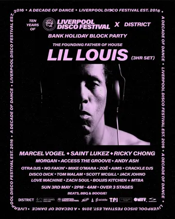 Lil Louis Bank Holiday Block Party takes place at District in Liverpool, Unknown on Sunday, May 3, 2026. Featuring Lil' Louis, Marcel Vogel, Ricky Chong, Saint Lukez and 2 more. House, Disco.
