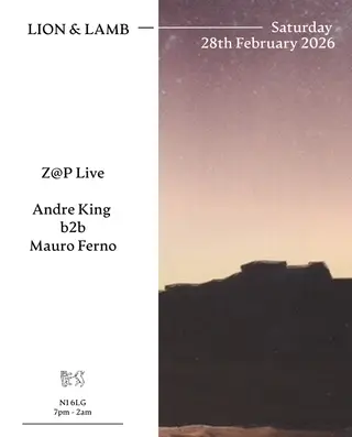 Lion & Lamb with Z@p Live + Andre King b2b Mauro Ferno on February 28, 2026 at The Lion and Lamb, London features Z@p, Andre King and Mauro Ferno performing house DJ sets.