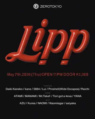 Lipp takes place at Zerotokyo in Tokyo, Japan on May 7, 2026. Featuring Daiki Kaneko, Kurea. House and R&B sounds all night.