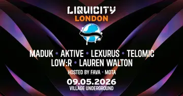 Liquicity London 2026 takes place at Village Underground in London, United Kingdom on Saturday, May 9, 2026. Featuring Maduk, AKTIVE, Lexurus, MOTA. Drum & Bass, Bass.