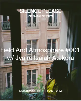 LISTENING SESSION: Field and Atmosphere #001 with Jyaire Isaiah Atakora takes place at Silence Please in New York City, United States on April 11, 2026. Ambient and Experimental sounds all night.