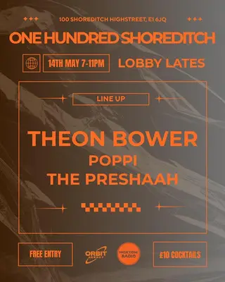 Lobby Lates on May 14, 2026 at The Lobby Bar at One Hundred Shoreditch, London features Theon Bower and Poppi performing house DJ sets.