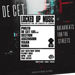 LOCKED UP MUSIC presents 'Breakbeats For The Streets' Launch at Planet Wax in London on May 16, 2026. The lineup features Philth, a notable figure in the drum and bass scene known for his intricate sound design and energetic productions. Ascension, also part of the lineup, brings a fresh approach to jungle music with a focus on classic breakbeat rhythms and deep basslines. This event will showcase the genres of drum and bass and jungle, emphasizing their roots and evolution within the electronic music landscape.