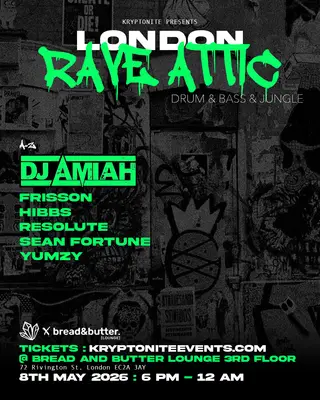 Set at Bread and Butter, London Rave Attic - Drum & Bass // Jungle 2026 brings together artists and fans in London on Friday, May 8, 2026, featuring Resolute. This event brings together artists and fans who share a passion for dance music culture and Drum & Bass, Jungle sounds. Bread and Butter has hosted Drum & Bass events in London as part of the area's regular club programming. It draws 1 artist and fans seeking authentic Drum & Bass music in London. Designed for a discerning audience, Bread and Butter's programming draws fans of Drum & Bass music across London. The production is designed to showcase the depth and diversity of contemporary electronic music.
