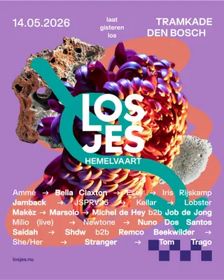 Losjes Hemelvaart on May 14, 2026 at Tramkade, 's-Hertogenbosch features Ammé, Bella Claxton, Essy, Iris Rijskamp, Jamback, JSPRV35, KELLAR, Lobster (NL), Makèz, Marsolo, Michel de Hey, Job de Jong, Milio, NewTone, Nuno dos Santos, SAIDAH, SHDW, Remco Beekwilder, SHE/HER, stranger (NL) and Tom Trago performing techno DJ sets.