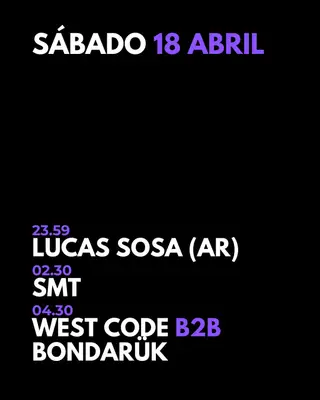 LUCAS SOSA - BONDARŨK - SMT - West Code on April 18, 2026 at Under Club, Buenos Aires features Lucas Sosa (AR), SMT (2), West Code and Bondarük performing techno DJ sets.