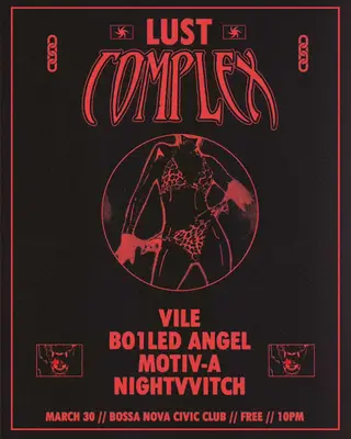 LUST COMPLEX with VILE + Bo1led Angel + motiv-a + NIGHTVVITCH takes place at Bossa Nova Civic Club in New York, United States on March 30, 2026. Featuring VILE, Boiled Angel, motiv-a, NIGHTVVITCH. Techno and EBM sounds all night.