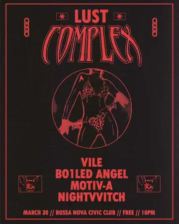 LUST COMPLEX with VILE + Bo1led Angel + motiv-a + NIGHTVVITCH takes place at Bossa Nova Civic Club in New York City, Unknown on March 30, 2026. Featuring VILE, Boiled Angel, motiv-a, NIGHTVVITCH. Techno, EBM.
