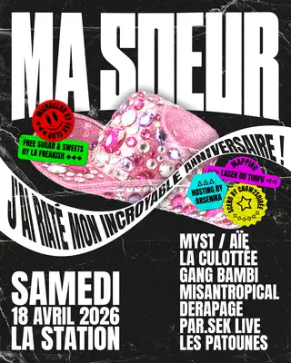 MA SOEUR A RATÉ MON INCROYABLE ANNIVERSAIRE takes place at La Station - Gare des Mines in Paris, France on April 18, 2026. Featuring Myst. Club sounds all night.