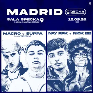 Macro y Suppa + Nay RPK y Nick BB I LlorandoLana - Specka Live takes place at Specka in Madrid, Spain on September 12, 2026. Hip-Hop sounds all night.