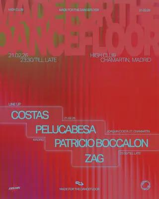 Made for the Dancefloor takes place at High Club Room in Madrid, Spain on February 21, 2026. Featuring Costas. Electronica sounds all night.