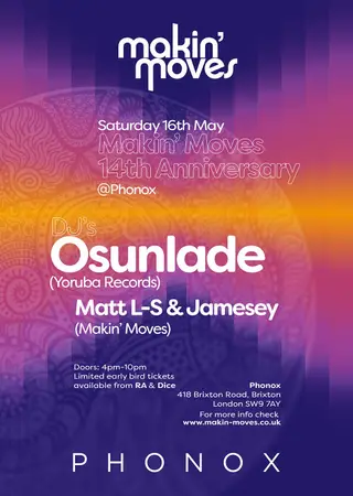 Makin' Moves 14th Anniversary: Osunlade takes place at Phonox in London, United Kingdom on May 16, 2026. Featuring Osunlade, Matt L-S, Jamesey.
