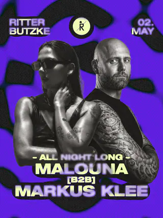 Malouna & Markus Klee (All-Night-Long) takes place at Ritter Butzke in Berlin, Germany on May 2, 2026. Featuring Malouna, Markus Klee. Techno sounds all night.