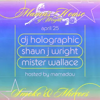 MAMA'S HOUSE OF WRIGHT on April 25, 2026 at Smoke & Mirrors, Chicago features DJ Holographic, Shaun J. Wright and Mister Wallace performing house DJ sets.
