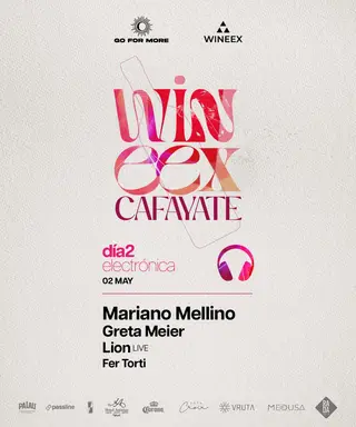 Mariano Mellino & MORE ARTISTS [DIA 2 - ELECTRONICA] - by WINEEX, CAFAYATE takes place at TBA - Finca El Recreo, Cafayate, Salta on May 2, 2026. Featuring Mariano Mellino, Greta Meier. Progressive House and Techno sounds all night.