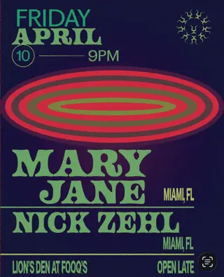 Mary Jane, Nick Zehl on April 10, 2026 at Lion's Den, Miami features Mary Jane (US) performing DJ sets.