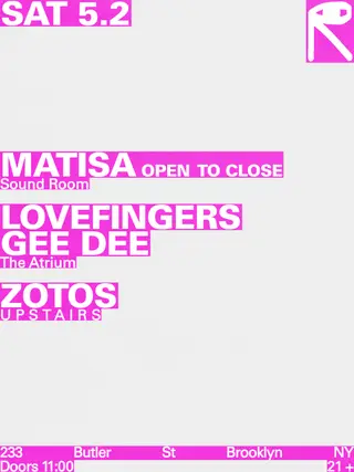 Matisa / Lovefingers, Gee Dee / Zotos on May 2, 2026 at public records, New York City features Matisa, Lovefingers, Gee Dee and Zotos performing techno DJ sets.