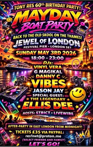 Mayday Boat Party takes place at MV Jewel Of London in London, United Kingdom on May 3, 2026. Breakbeat and Hardcore sounds all night.