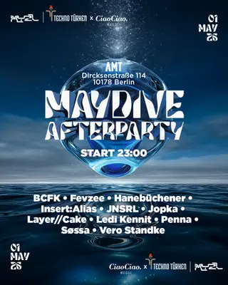 MAYDIVE Afterparty on May 1, 2026 at AMT, Berlin features BCFK, FEVZEE, Hanebüchener, JNSRL, Jopka, Penna, søssa and Vero Standke performing techno DJ sets.