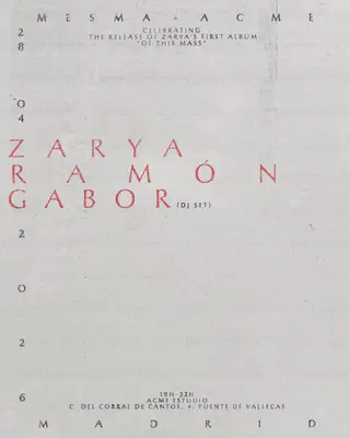 Mesma + Acme present: Zarya's Album Release Evening takes place at Acme Estudio in Madrid, Spain on April 28, 2026. Featuring Zarya (2), Gabor (FR). Ambient and Experimental sounds all night.