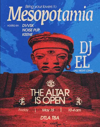 Mesopotamia — DJ EL: Dark. Acid. Ancient. All night long. Hosted by DVVSK, Noise Pup, KEENE on May 15, 2026 at TBA - DTLA, Los Angeles features electronic music performances techno DJ sets.