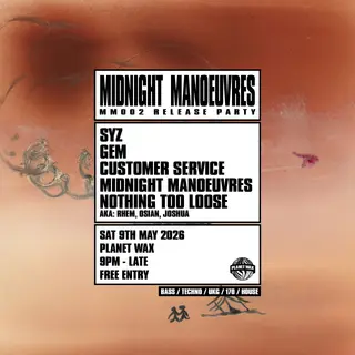 Midnight Manoeuvres - MM002 RELEASE PARTY on May 9, 2026 at Planet Wax, London features Syz, Customer Service and Midnight Manoeuvres performing techno DJ sets.