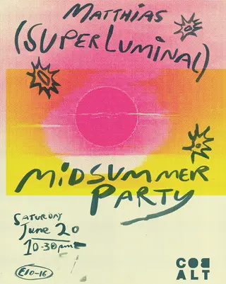 Midsummer Party takes place at Cobalt Studios in Newcastle, United Kingdom, on June 20, 2026. The event features Matthias, known for his work as a techno producer and part of the label Superluminal. Matthias has gained recognition for his distinct sound within the techno genre. This event will showcase the techno genre through Matthias's performance.